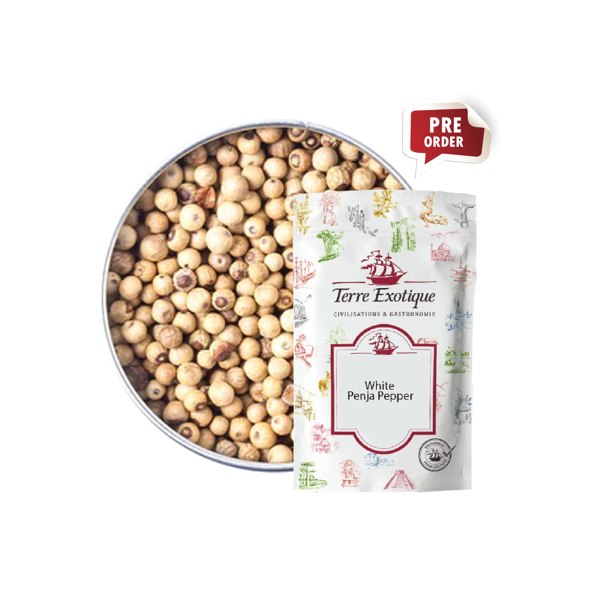 The pepper plant is a vine that grows on a stake. When it reaches maturity, its berry is stripped of its skin and becomes white pepper.
